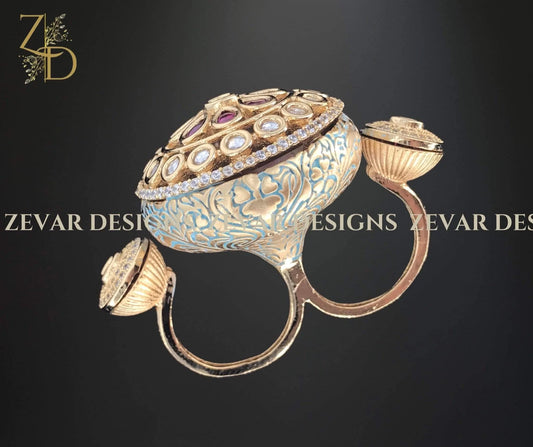 Designer Kundan Meena Double Ring - Blue