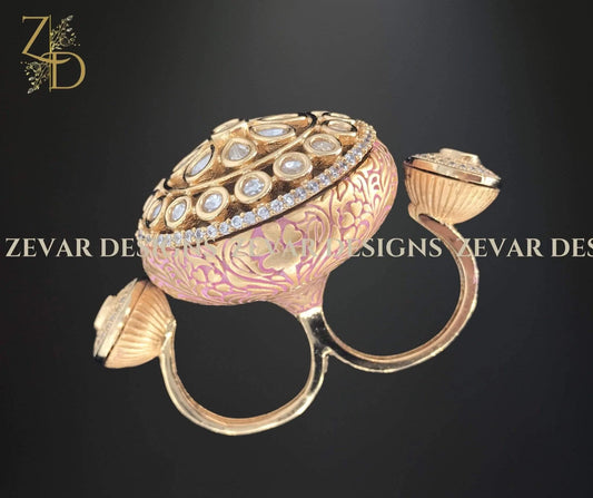 Designer Kundan Meena Double Ring - Pink