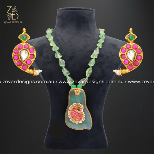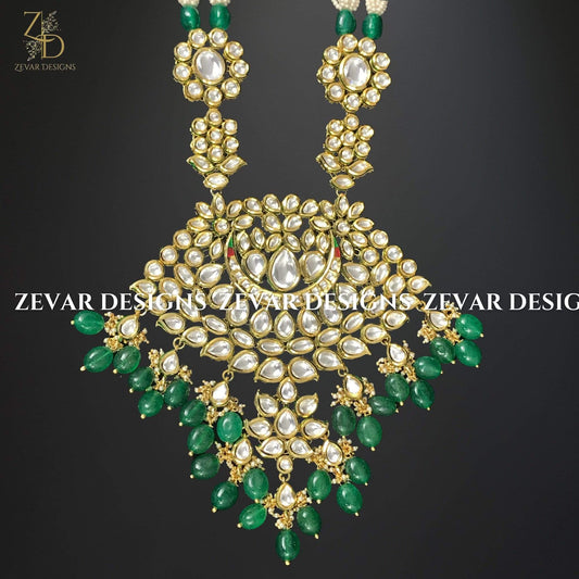 Kundan Long Set with Tikka and Oversize Pendant - Emerald Green