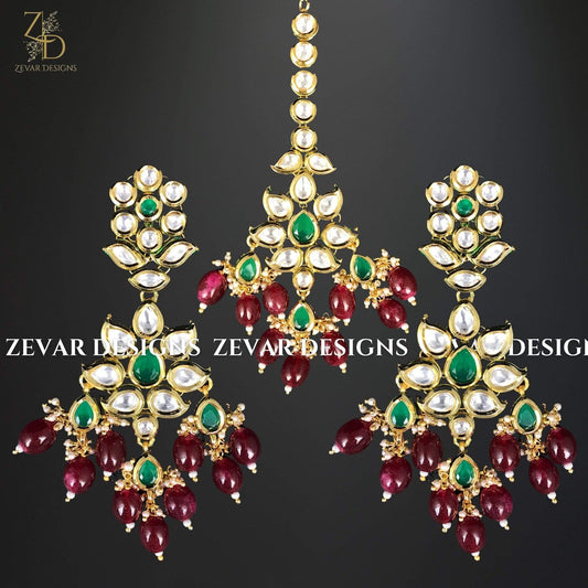Kundan Long Set with Tikka and Oversize Pendant - Red and Green