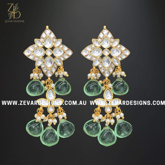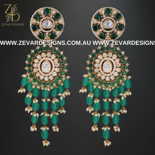 Kundan Polki Long Set - Emerald Green and Rose Gold